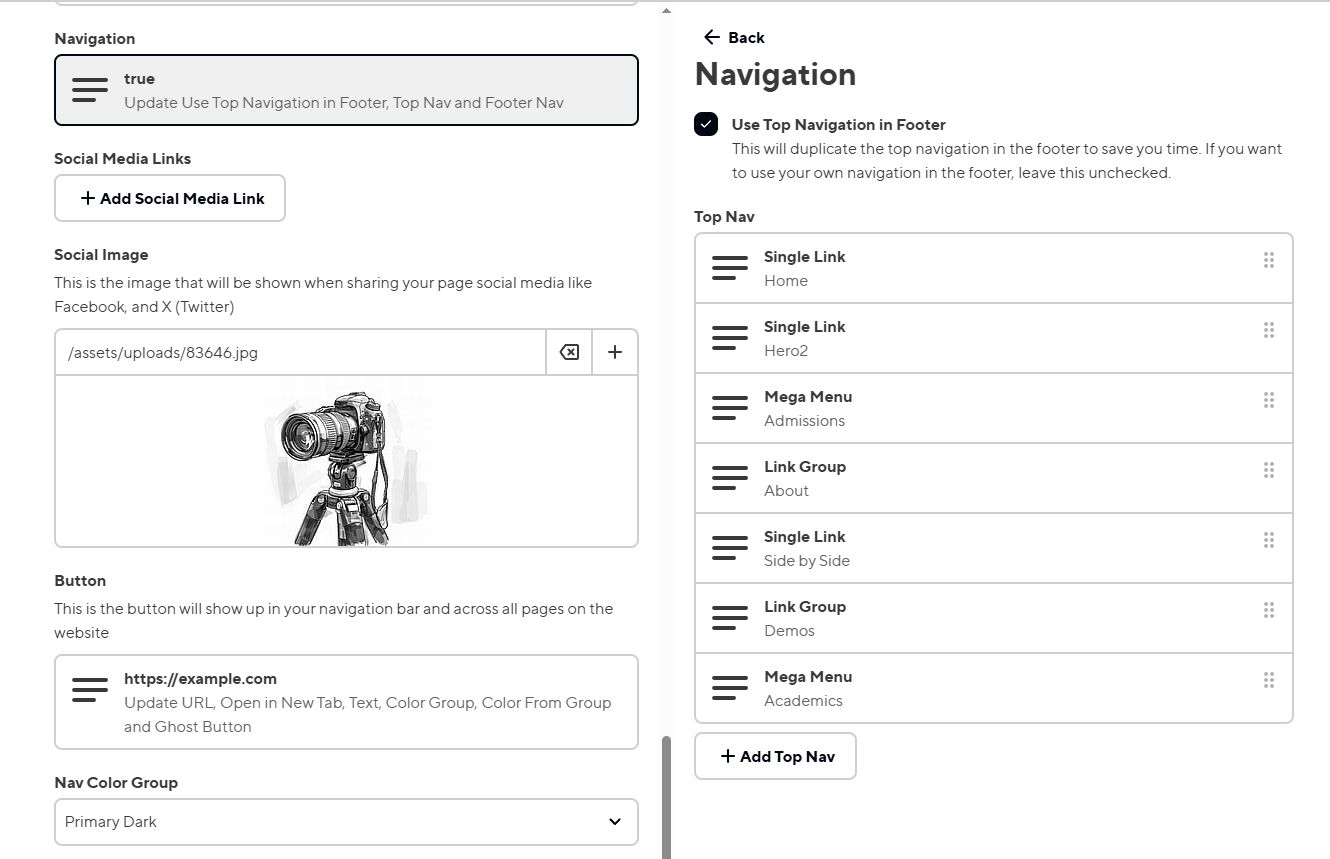 The first option of Use top Navigation in Footer will add the top navigation to the footer. This is useful if you want to have a consistent footer across your website. If you uncheck this option you’ll have the freedom to create a navigation for your footer that is separate for the top navigation.