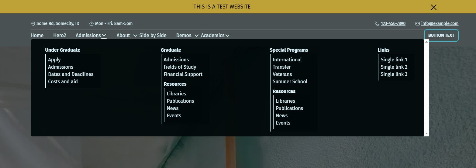 Mega Menu’s are a way to add a lot of pages to the navigation. This is useful for when you have a lot of pages that are related to each other. This will render as large drop down in the navigation. Mega Menus are best used when you are you have many related Link groups.