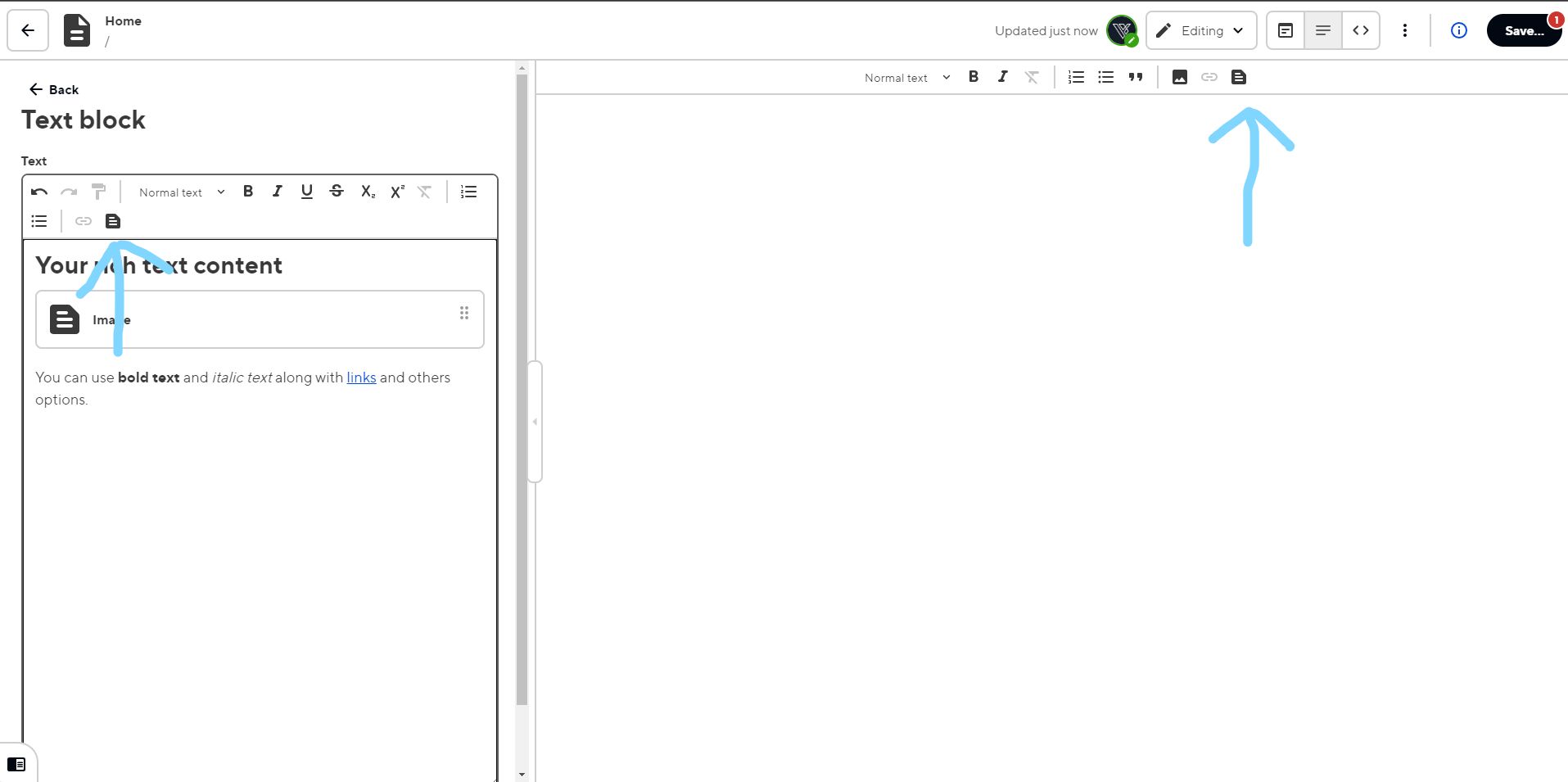 Snippets can be access by clicking on the Snippet Icon in found within the content editor, or the Text block of the “Simple Text Block” section.