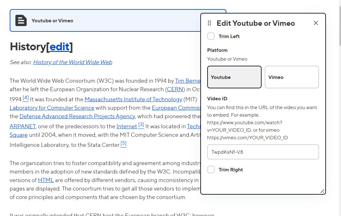 To embed a video you’ll need to the know the video’s id of the platform that you are looking for. You can find this by looking at the URL of the platform when you have that video selected.